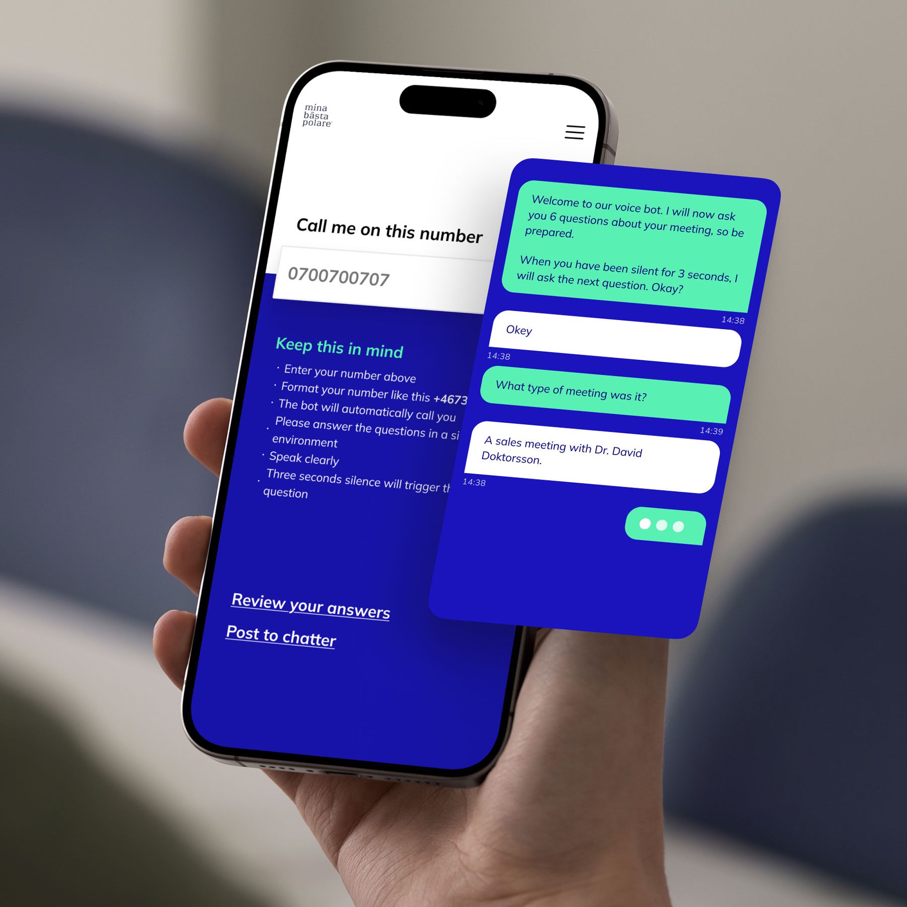 Vi utvecklade en röstbaserad bot för automatisk insamling av säljrapporter. Lösningen byggdes i steg: först test av teknisk genomförbarhet med Googles Speech-to-Text AI, sen en voice bot aktiverad av kalenderhändelser för säljmöten. Efter möten ringer boten säljaren och ställer frågor om kunden, produkter, intressanta punkter och uppföljning. Svaren transkriberas och översätts till engelska innan export till Salesforce, där AI (artificiell intelligens) förbättrar rapportering och säljprocessen.